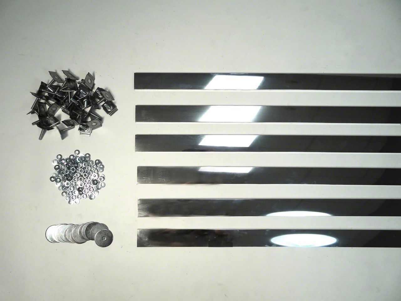 These strips use a completely hidden fastening system developed by MAR-K. Special bolts slide into the groove on the underside of the strip to adjust to any bolt location. Clear anodized aluminum strips are precut to correct length for your truck. Bed strips include the correct number of (1 1/4") hidden fasteners for your truck. Customer may need to purchase a bolt kit for bed-to-frame and side mounting. This truck requires 6 bed strips. Made in Oklahoma City, USA