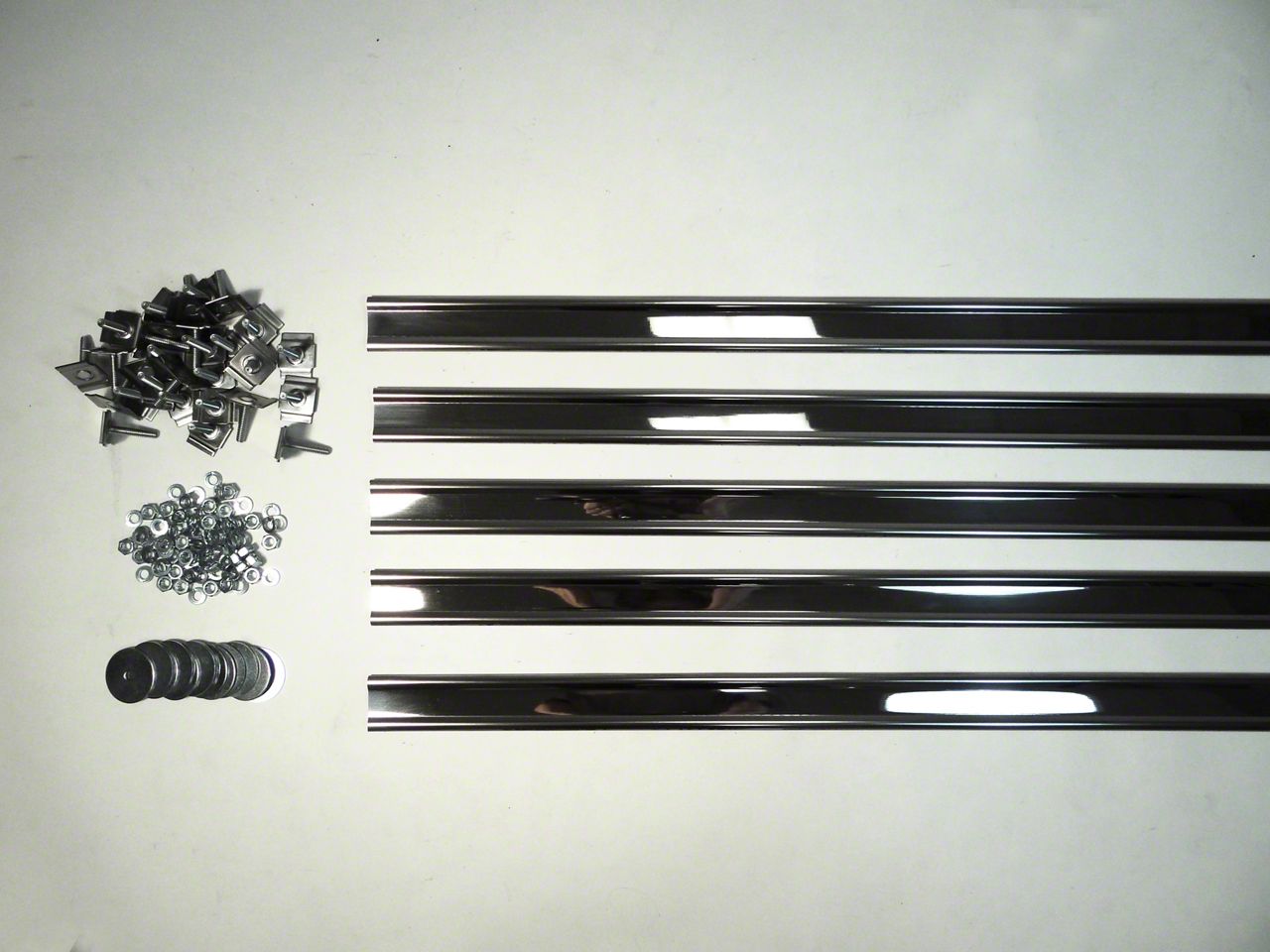These strips use a completely hidden fastening system developed by MAR-K. Special bolts slide into the groove on the underside of the strip to adjust to any bolt location. Polished bed strips are very shiny, giving them a "chrome" look. These strips are precut to correct length for your truck. Bed strips include the correct number of (1 1/4") hidden fasteners for your truck. Customer may need to purchase a bolt kit for bed-to-frame and side mounting. This truck requires 5 bed strips. Made by MAR-K in Oklahoma City, USA. Each strip is 1 1/2" wide. Stainless steel is type 430, bright and magnetic.