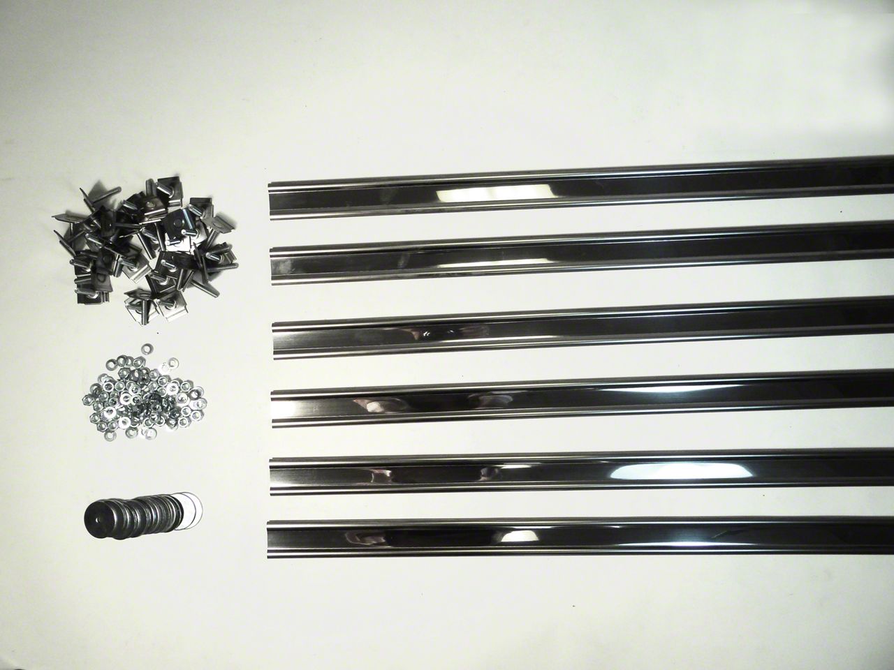These strips use a completely hidden fastening system developed by MAR-K. Special bolts slide into the groove on the underside of the strip to adjust to any bolt location. Unpolished bed strips are shiny, but not as shiny as polished stainless. These strips are precut to correct length for your truck. Bed strips include the correct number of (1 1/4") hidden fasteners for your truck. Customer may need to purchase a bolt kit for bed-to-frame and side mounting. This truck requires 6 bed strips. Made by MAR-K in Oklahoma City, USA. Each strip is 1 1/2" wide. Stainless steel is type 430, bright and magnetic.