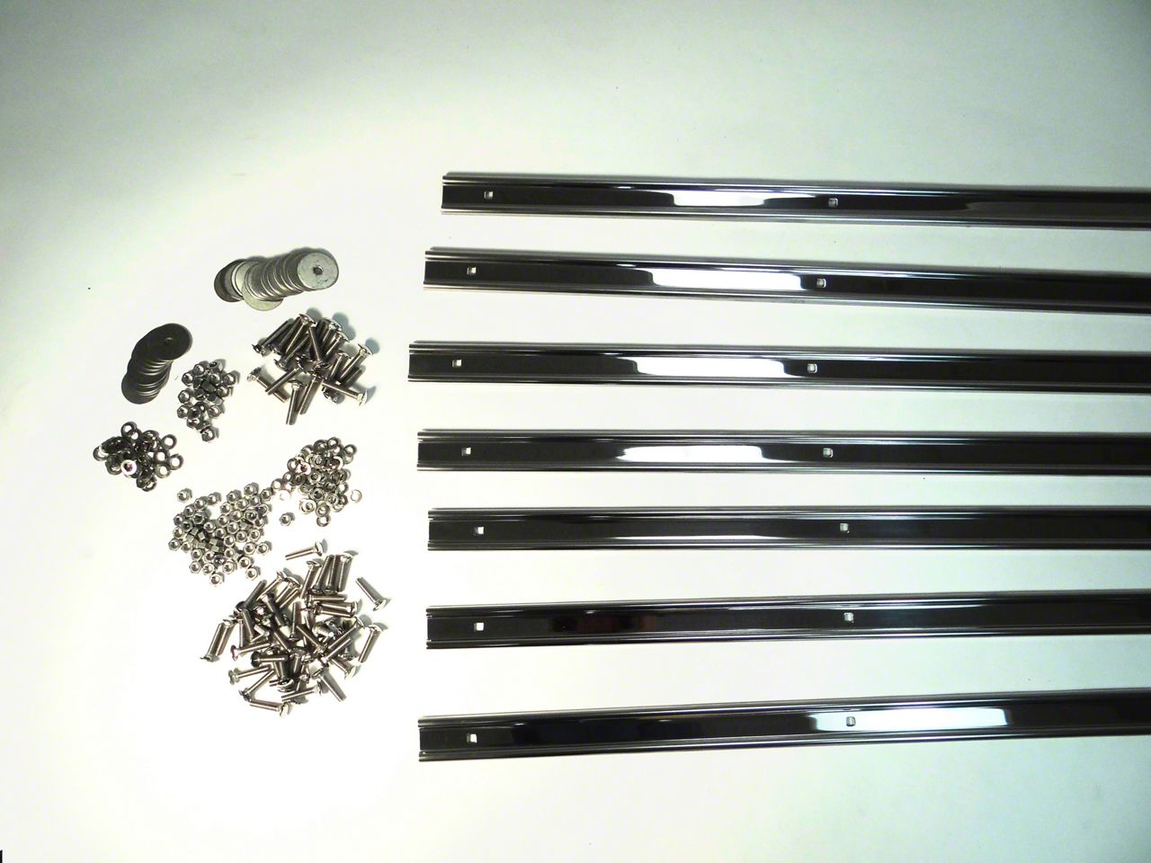 Polished bed strips are very shiny, giving them a "chrome" look. Bed strips are punched with square holes according to the original pattern. Each strip is 1 1/2" wide and 18 gage thickness. Stainless steel is type 430, bright and slightly magnetic. This truck requires 7 bed strips. This kit includes the bed strip and angle strip bolts needed for this truck. Made in Oklahoma City, USA.