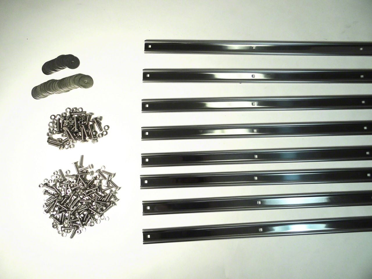Unpolished bed strips are shiny, but not as shiny as polished stainless. Bed strips are punched with square holes according to the original pattern. Each strip is 1 1/2" wide and 18 gage thickness. Stainless steel is type 430, bright and slightly magnetic. This truck requires 8 bed strips. This kit includes the bed strip and angle strip bolts needed for this truck. Made in Oklahoma City, USA.