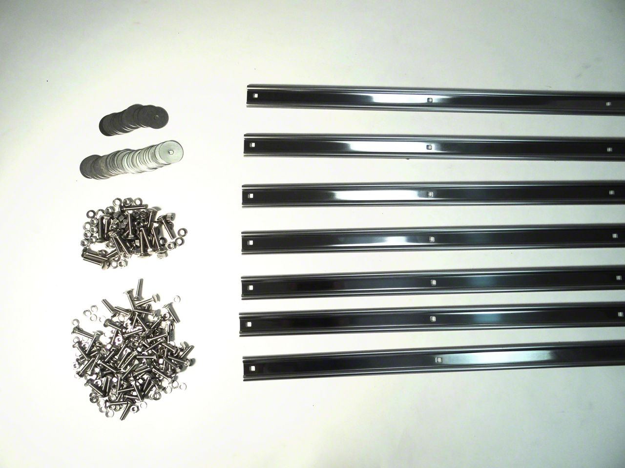 Unpolished bed strips are shiny, but not as shiny as polished stainless. Bed strips are punched with square holes according to the original pattern. Each strip is 1 1/2" wide and 18 gage thickness. Stainless steel is type 430, bright and slightly magnetic. This truck requires 7 bed strips. This kit includes the bed strip and angle strip bolts needed for this truck. Made in Oklahoma City, USA.