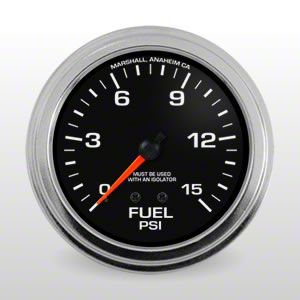2-5/8" Fuel Pressure Gauge. Black Dial, Mechanical Performance Gauge. Includes mounting hardware and 12 volt lighting. Must be used with an isolator (not included) if mounted inside the cabin.High performance at an affordable price. Our 2-5/8" Comp II full sweep mechanical gauges are ideal for street, sport compact, strip and oval track use. They feature rugged bronze bourdon tube movements, white or black dials, bold and easy-to-read numbers and bright orange pointer. Gauges include necessary tubing kits and mounting hardware.Snap-On Silver Aluminum BezelGauges include a chrome bezel for a retro look and anodized silver snap-on bezel for a modern sport appearance.Through Dial LightingThough-the-dial lighting provides crisp, illuminated numbers and markers at night.