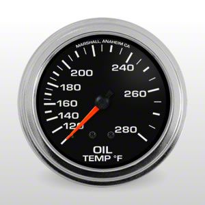 2-5/8" Oil Temperature Gauge. Black Dial, Mechanical Performance GaugeIncludes 6 foot capillary with 1/2 inch fitting, mounting hardware and 12 volt incandescent lighting.High performance at an affordable price. Our 2-5/8" Comp II full sweep mechanical gauges are ideal for street, sport compact, strip and oval track use. They feature rugged bronze bourdon tube movements, white or black dials, bold and easy-to-read numbers and bright orange pointer. Gauges include necessary tubing kits and mounting hardware.Snap-On Silver Aluminum BezelGauges include a chrome bezel for a retro look and anodized silver snap-on bezel for a modern sport appearance.Through Dial LightingThough-the-dial lighting provides crisp, illuminated numbers and markers at night.