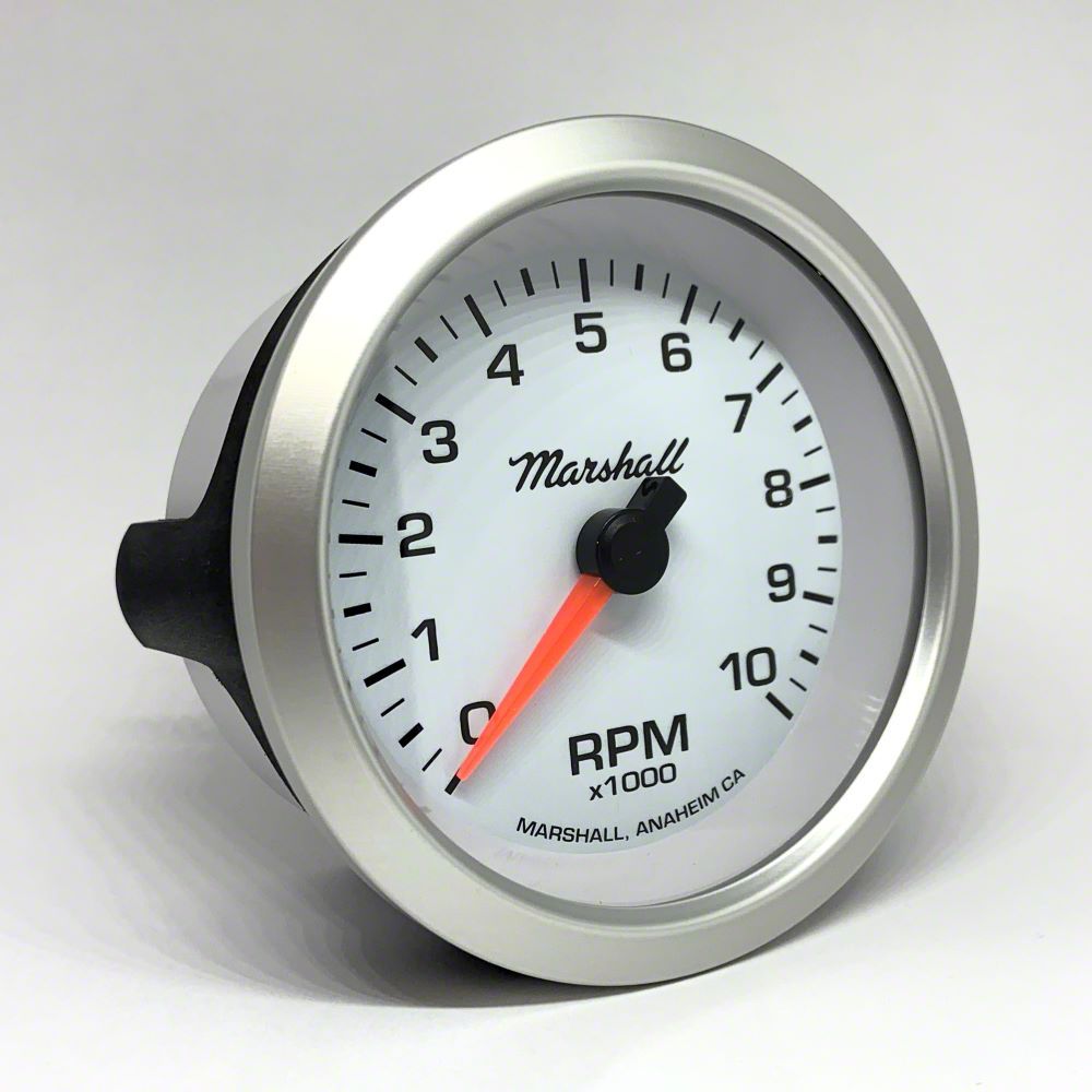 High-Performance Tachometer. The Marshall Instruments COMP II LED White Dial 3-3/8-Inch In-Dash Tachometer; 0-10000 RPM; Silver Aluminum Bezel is designed to accurately measure and display engine RPM for precise performance monitoring. It provides critical readings essential for tuning and maintaining engine health, making it a must-have instrument for automotive enthusiasts and professionals.
