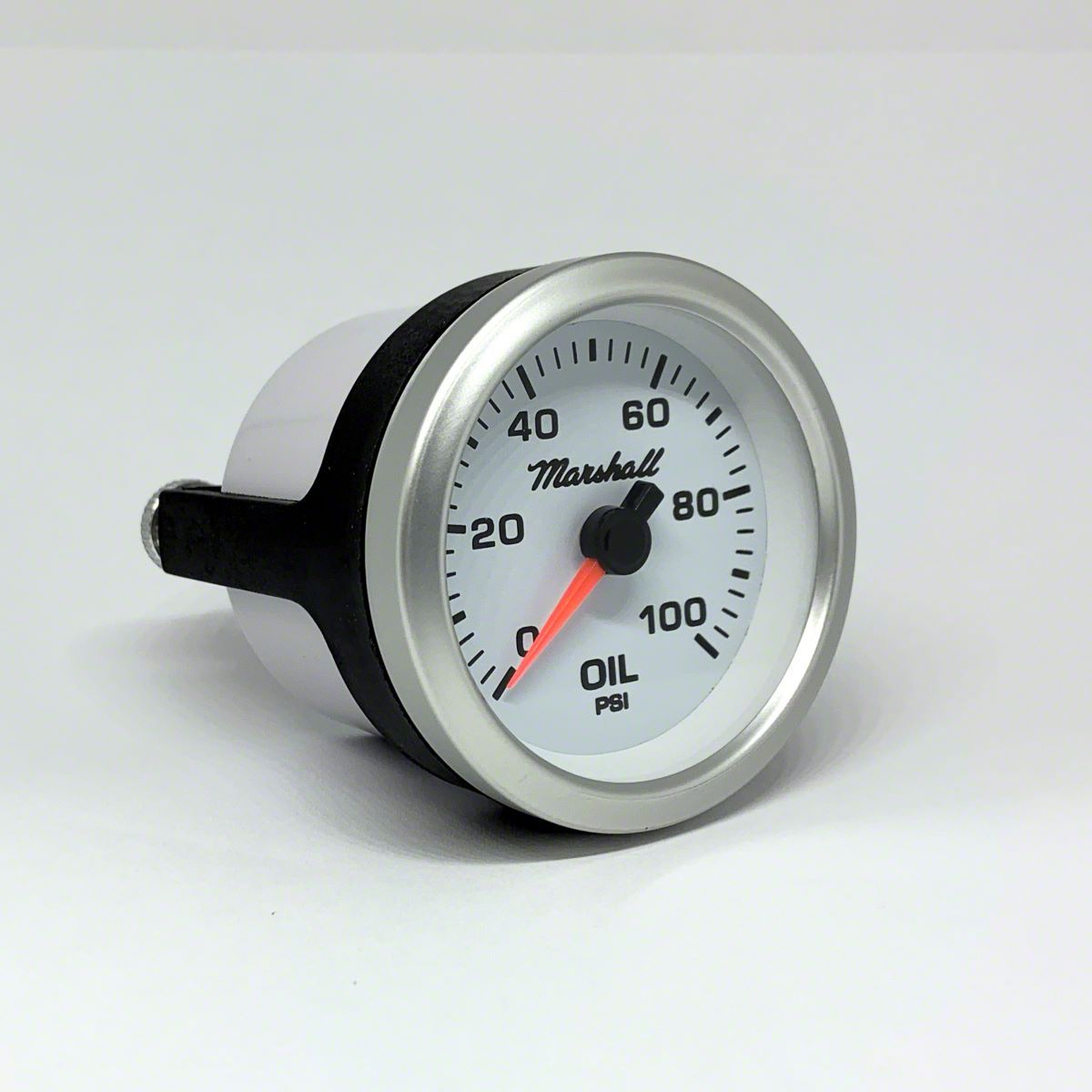 Accurate Oil Pressure Gauge. The Marshall Instruments SCX White Dial 2-1/16-Inch Oil Pressure Gauge with a 0-100 PSI range and silver aluminum bezel provides precise and reliable oil pressure readings essential for monitoring engine performance. Designed for electric operation with a full sweep dial, it clearly indicates oil pressure to the driver or technician, helping prevent engine damage by alerting users to abnormal oil pressure conditions.