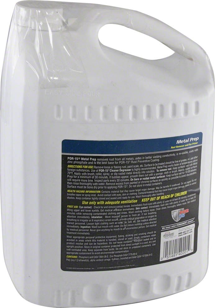 PREP & READY provides the best adhesion for POR-15 on any metal surface, including aluminum and shiny polished metal surfaces. This simple process gently etches metal, creating an ideal anchor pattern for coatings such as POR-15®, while simultaneously leaving a zinc phosphate coating to insure chemical bonding of paint andsteel. PREP & READY Features Easy to use - one step process No harmful residues Is reuseable Removes surface rust in minutes Coats metal with zinc phosphate Insures perfect paint adhesion Provides perfect base for all paints Gives better welding conductivity. Avoid other preps that may leave harmful residues which prevent proper adhesion. After thoroughly degreasing your work piece, apply environmentally safe PREP & READY to both neutralize any rust and etch any clean bar