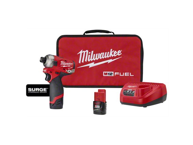 Our M12 FUEL SURGE™ �” Hex Hydraulic Driver is the industry's first 12-volt hydraulic driver. Featuring our FLUID-DRIVE™ Hydraulic Powertrain, the hydraulic driver will let you experience operation up to 2X quieter with less vibration for smoother and faster driving speeds compared to standard impacts. The compact size of the tool and battery give you unmatched access in tight spaces and allows for easy transport on a tool belt and easy fitting into your job site tool bag. The POWERSTATE™ Brushless Motor delivers up to 0-3,200 RPM with constant power output to drive screws faster. Built-in REDLINK PLUS™ Intelligence is the most advanced electronic system on the market, preventing damage to your tool and battery caused by overloading or overheating. The cordless hydraulic driver is compatible with all Milwaukee® M12™ REDLITHIUM™ Compact Batteries or Extended Capacity Batteries, providing you with more work per charge and more work over the life of the pack than competitive batteries. The impact driver's 4-Mode DRIVE CONTROL gives you greater control over output speed and power for greater versatility in a wide range of applications. Self-Tapping Screw Mode reduces walking when you are self-tapping screws as well as reduces overdriving, breaking and stripping out screws.