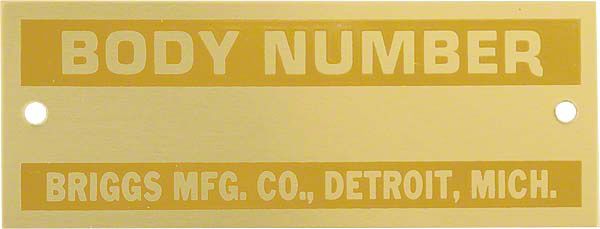 The Briggs Body Company supplied Ford with bodies for numerous Model A styles throughout production. They attached body number tags in two different styles; stripe and frame. This version has a brass plate. As the name implies the stripe style has painted panels above and below the natural colored numeral field, while the frame style completely bordered this area. These accurate reproductions are intended to replace originals which would detract from your restoration. Local engravers can typically recreate the style of the body number from original tags and engrave these new tags for minimal cost. Trust MAC's to help you find what you need to finish your project the way you want it.
