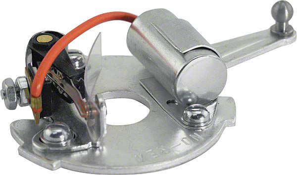 Modern style, with the condenser and points mounted to the plate. It cannot be used in conjunction with the A12148W lower plate pig tail wire. Utilizes points mounted to plates to reduce point bounce, and improved wear.