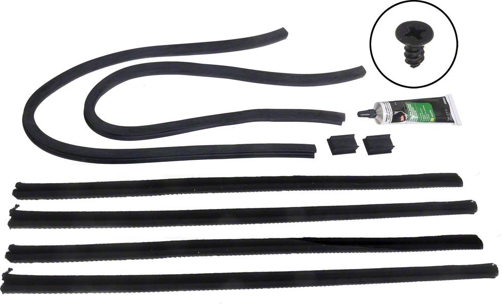 The kits include upper window sponge seals, T shaped anti-rattle rubber (when required), lower glass cushion bumpers & adhesive. Each piece has specific applications, this is not a general mix of pieces.