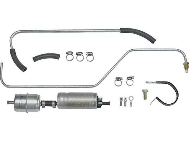 Includes the pump with correct PSI, filter, gas lines, fittings, clamps and hoses. It mounts with a fender to frame bolt below the carburetor.