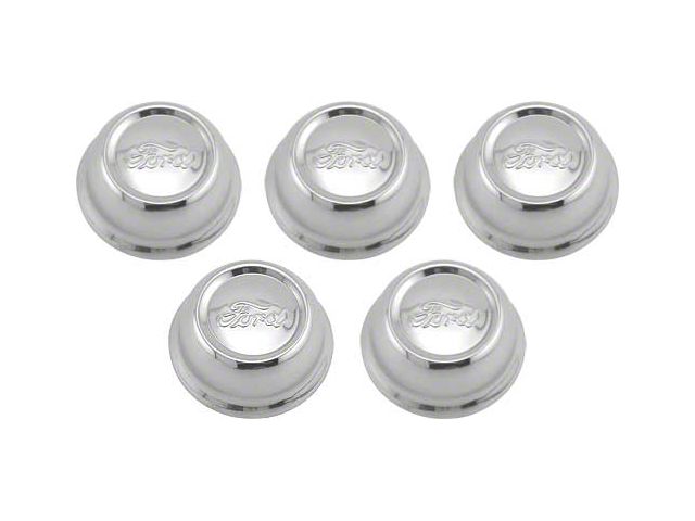 Model A Ford Hub Cap Set - 5 Pieces - Chrome Plated - Ford S,cript - Fits 2-5/8 Rim Opening - Reproduction