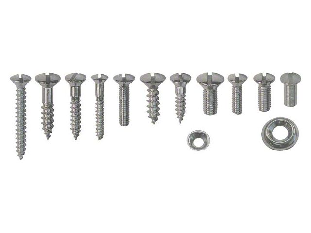 This interior trim screw set includes all screws necessary for the complete interior of the car, including: window frame, dash rail, instrument panel, door sill, dovetail, etc. Also when required, the tube nuts and convertible rear window frame screws are supplied. These kits are not a general mixture of hardware, but exact pieces for the stated year and body style. Interior trim sets are US made.