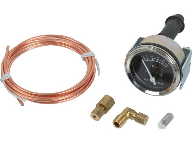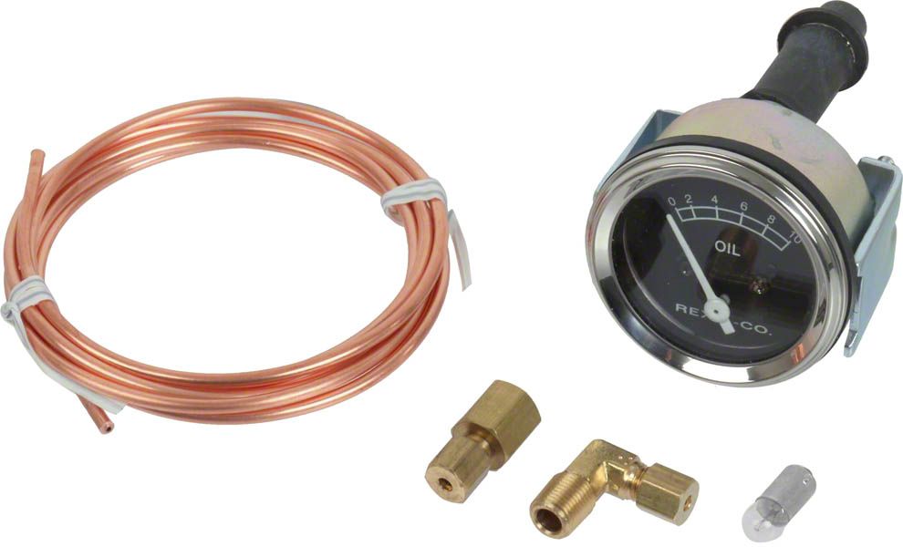This is complete with the A6602H hookup kit (6' of 1/8" tubing, 2 nuts, 2 ferrules and adapter fitting), bulb and instructions. The gauge face reads 0-10 lbs. of oil pressure.