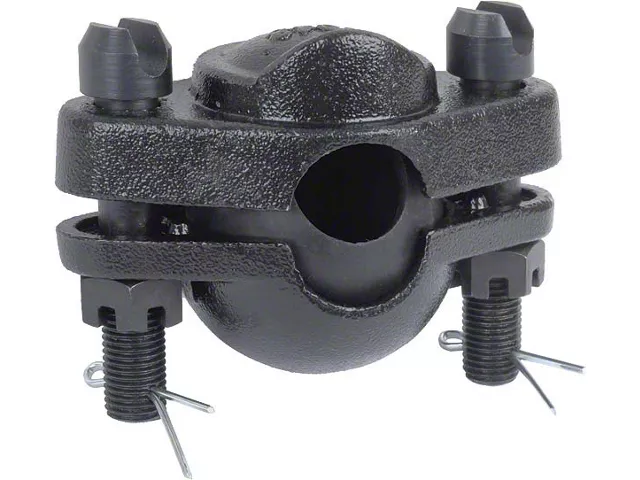 Rubber bushing replacement type compensates for worn ball, cast iron cap style. 9 Piece kit includes 2 special bolts, upper & lower caps, 2 special 7/16" castle nuts, a rubber radius ball cap bushing & cotter pins.
