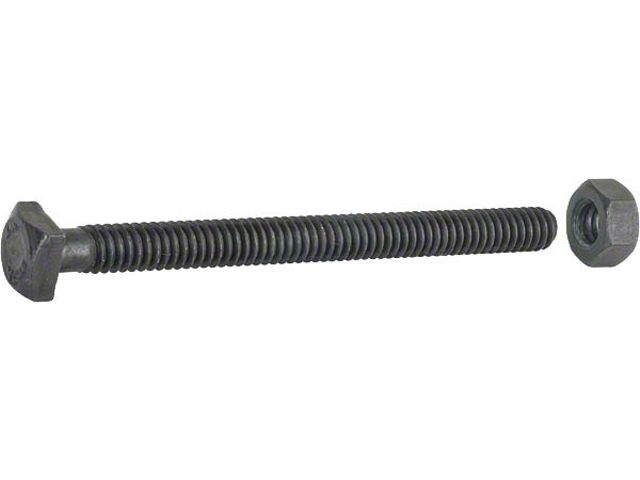 2 square head bolts 1/4"-20 x 2-7/8" and 2 hex nuts. Clamp not included. The nuts face the front of the car. These can be used to replace hex-head bolts for originality.