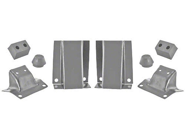 This set includes stamped steel stops & platform supports with rubber bumpers & bolts. You must drill the holes. The part with the rubber stop is on top while the other is used on the seat frame as a brace.