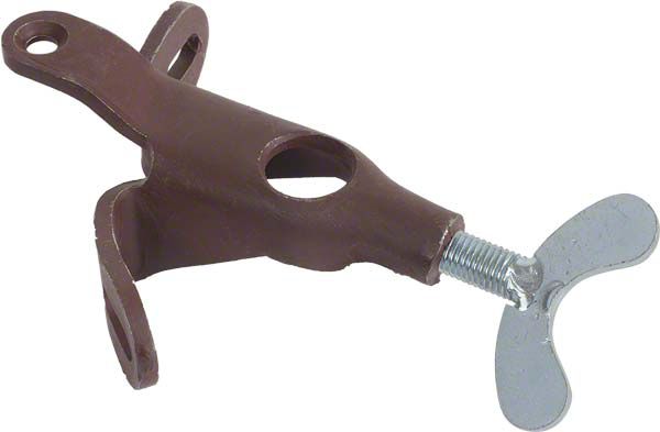 These brackets hold the top to the top of the windshield stanchions. The brackets are mounted on the front corner of the top irons. Both brackets have a fine thread, order A37472F to dress them up.