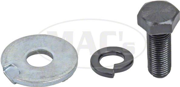 (1) bolt, (1) lock washer and 1 thick washer with tab. The tabbed side of washer goes in first. Torque to 22 foot pounds.