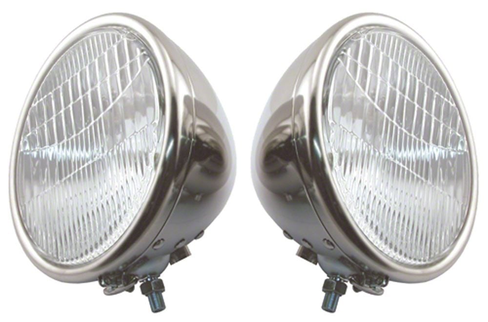 Model A Ford Headlights - Complete - Stainless Steel - 2 Bul,b Type - Ford Script - 12 Volt Halogen - Turn Signals Includ,ed