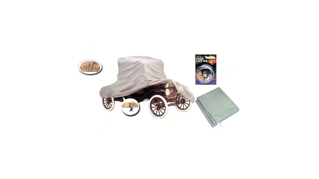 These car covers are a 65-35 poly-cotton blend. The soft cotton inside won't hurt the most delicate lacquer paint job. The exterior is treated for optimum protection and water repellency. This design allows the cover to breathe. All covers have special built-in elastic tensioners to ensure a snug fit. Recommended for indoor use and machine washable. Covers weigh from 12 - 16 pounds depending upon style.
