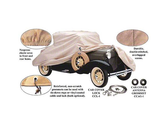 These car covers are made of gray colored Technalon. THEY ARE SIMPLY THE BEST! These are the most rain resistant breathable car covers on the market. They are a high-tech three layer fabric, lightweight, pliable in all weather conditions & won't smell, rot or mildew. The outside & inside cover are made of long fibers which make the fabric very tough, but very soft and non-abrasive. The middle layer is made of shorter fibers that catch water, but still allows air to circulate. These covers have double stitched seams and neoprene elastic sewn into the hems at the front & rear for a snug, perfect, custom fit! They come equipped with non-scratch plastic grommets reinforced into the lower sides, which will accommodate the tie down rope. This is an inexpensive investment f