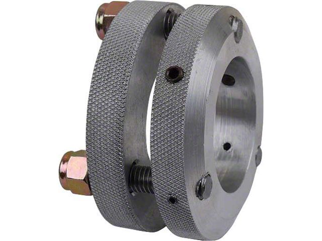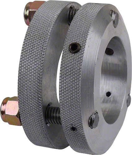 The upper ring is held to the manifold with allen headed set screws. The lower ring is slipped over the exhaust pipe and is drawn in with three allen headed bolts. Still uses the tapered flange for sealing.