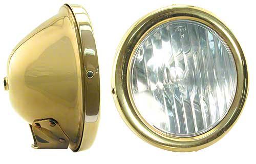 This is a complete pair of headlight assemblies that have brass buckets and brass rims for bar mounting. An excellent choice for street rod applications.