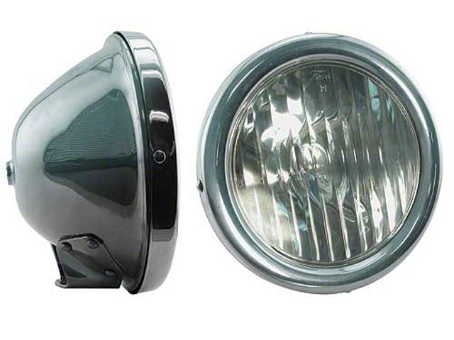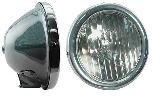 This is a complete pair of headlight assemblies that have chrome buckets and chrome rims for bar mounting. An excellent choice for street rod applications.