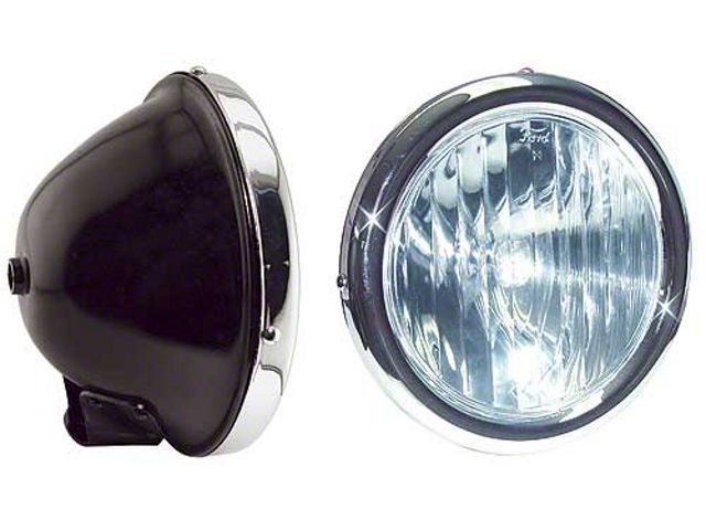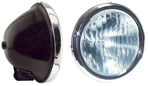 This is a complete pair of headlight assemblies that have gloss black buckets and nickel rims for bar mounting.