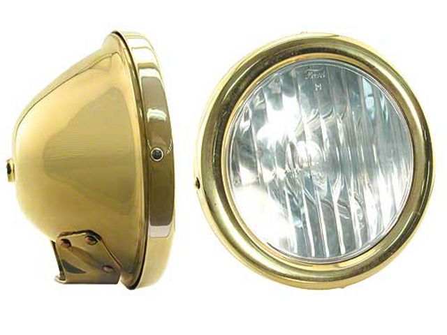 This is a complete pair of headlight assemblies that have brass buckets and brass rims for bar mounting. An excellent choice for street rod applications.