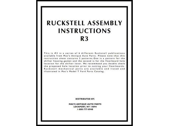 This is number 3 in a series of Ruckstell publications, containing a pattern for the shifter housing gasket and a pattern for the floorboard hole location for the shifter lever. The instructions are enhanced by illustrations and reference photos.