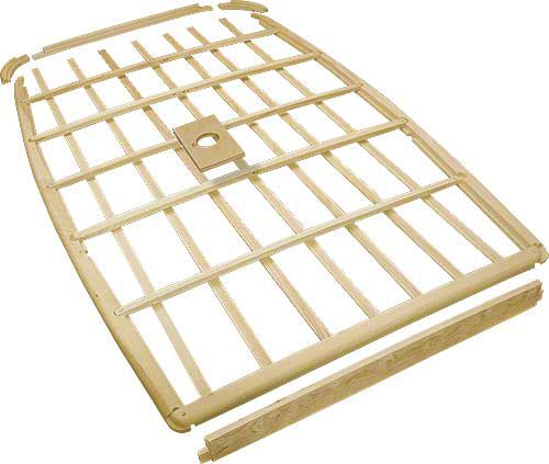 This kit includes: Top ribs, header, right and left side rails, rear cross member, rear corner rails, top slats, dome light board, and head board below the header.