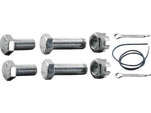 This 9 piece set contains drilled bolts, castle nuts, cotter pins & safety wire for the universal joint.