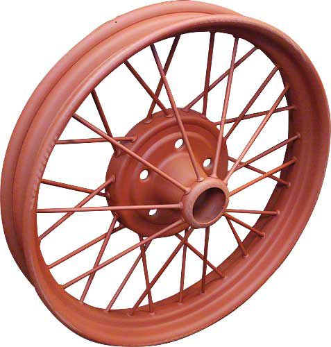 A reproduction of the original Model T wire wheel with primer so you can paint it any color.