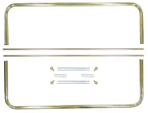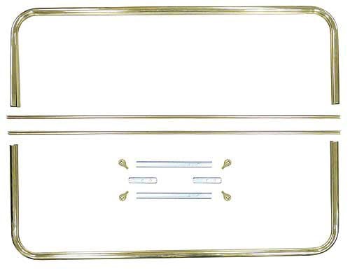 A brass windshield frame with brass glass channel. The upper frame measures 41-1/2" x 12-3/4" and the lower frame measures 41-1/2" x 14-3/4".