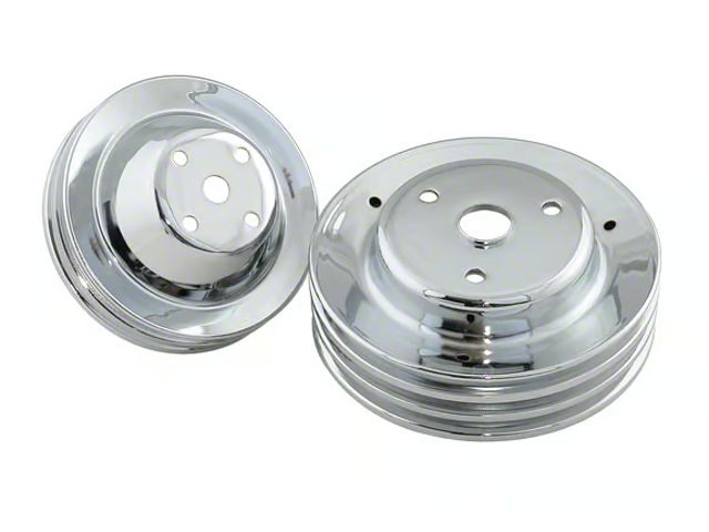Construction and Appearance. Crafted from durable steel and finished in polished chrome, this pulley set provides a high-shine appearance and corrosion resistance. The crankshaft pulley measures 7.3 inches in diameter, while the water pump pulley comes in at 6.3 inches. The combination delivers reliable accessory drive while adding a custom show-ready look under the hood.