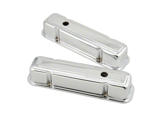 Chrome plated stamped steel valve covers have a flat smooth top, with internal baffles. Tall-style cover provides extra valve train clearance. Sold as a pair.
