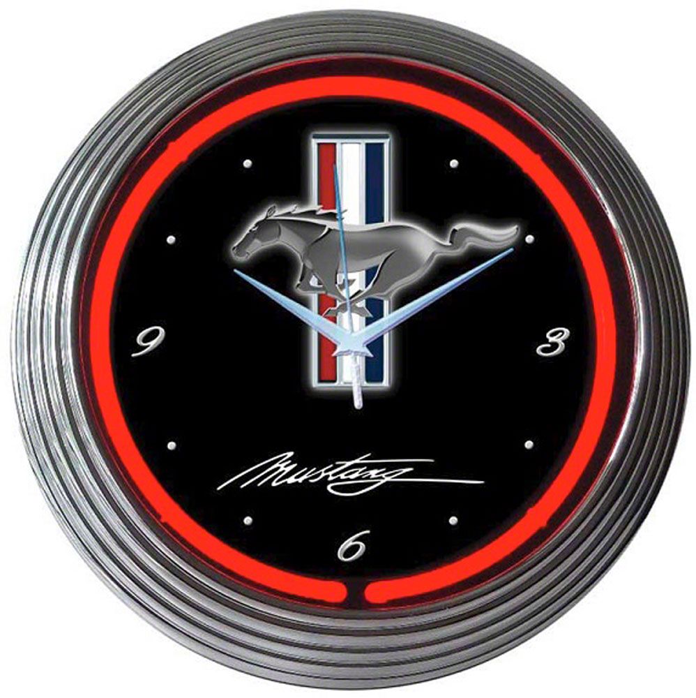 Mustang Clock, Red Neon, Mustang Script With Logo