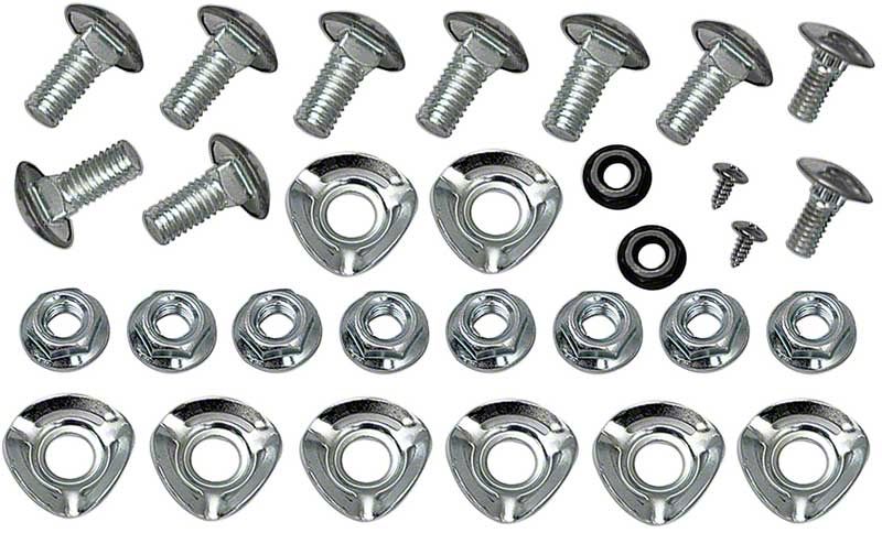 Reproduction bumper bolt mounting kit for 1964-70 Mustangs. Each kit contains enough mounting hardware to mount both front and rear bumpers to the bumper brackets. This 28 piece set includes 8 large bumper bolts, 8 large washers, 8 large nuts, 2 small bumper bolts and 2 small nuts.