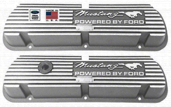 These officially licensed Mustang aluminum valve covers are back! These are hands-down the highest quality valve covers available today. They are made with pride in the USA and feature die-cast aluminum construction with integrated heat-sink fins for years of lasting performance. The authentic design of these valve covers has squared off bolt access ports modeled after original Shelby cast valve covers from the 60's. They also feature exclusive low profile baffles providing maximum clearance for high lift cams and most aftermarket roller rocker arms. These will not fit the 5.0L EFI engine.
