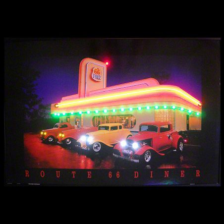 The First Hot Rods '32-'35 Classic Ford Coupes And Open Roadsters Parked In Front Of The Route 66 Diner. Mini Light Bulbs In headlights Of Red '35 Ford Coupe. Red And Yellow LED Lights Accent Parking Lights And Building. It Is Fully Framed And Ready To Hang, Just Plug In The Included AC Adaptor.