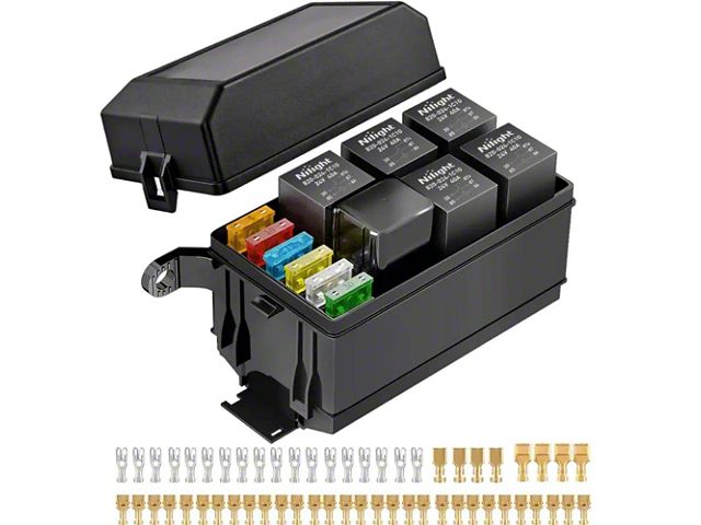 Nilight Bosch Style Relay Fuse 40Amp Relay Box Kit. This Nilight Bosch Style Relay Fuse 40Amp Relay Box Kit consolidates up to four high-current circuits into a single compact module, simplifying under-hood wiring and protecting your accessories. Each Bosch-style relay is rated for continuous 40 Amp loads with heavy-duty silver contacts to handle winches, light bars, ventilation fans, and other high-draw devices without overheating or failure.