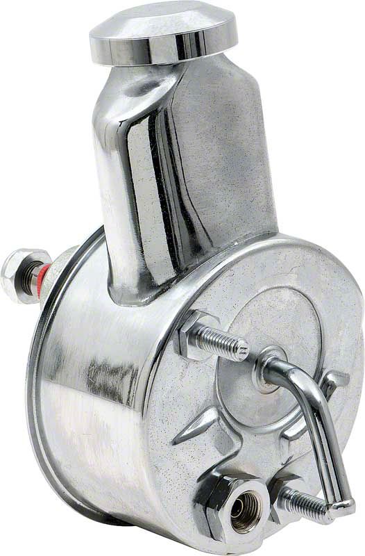 Dress up your engine compartment with this all new Authorized chrome power steering pump with a banjo style reservoir. This all new pump is a great replacement for small block or big block models. This power steering pump features a reservoir in the correct original configuration with the proper return fitting and clocking. This not only improves authenticity, but makes installation quick and easy.