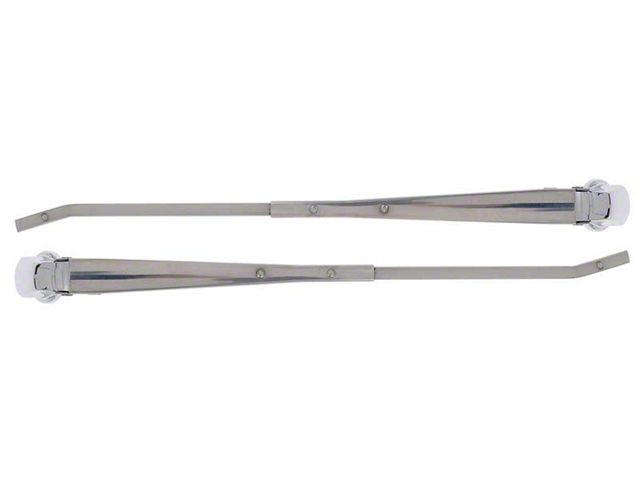Reproduction wiper arms manufactured in polished stainless steel for various GM models. Arm measures approx. 13" from the wiper arm tip to the center of the wiper shaft. Fits 5/8" diameter shaft. Accepts Trico or Anco blades with 1/4" bayonet-style connector. Sold in pairs. Includes RH and LH sides.