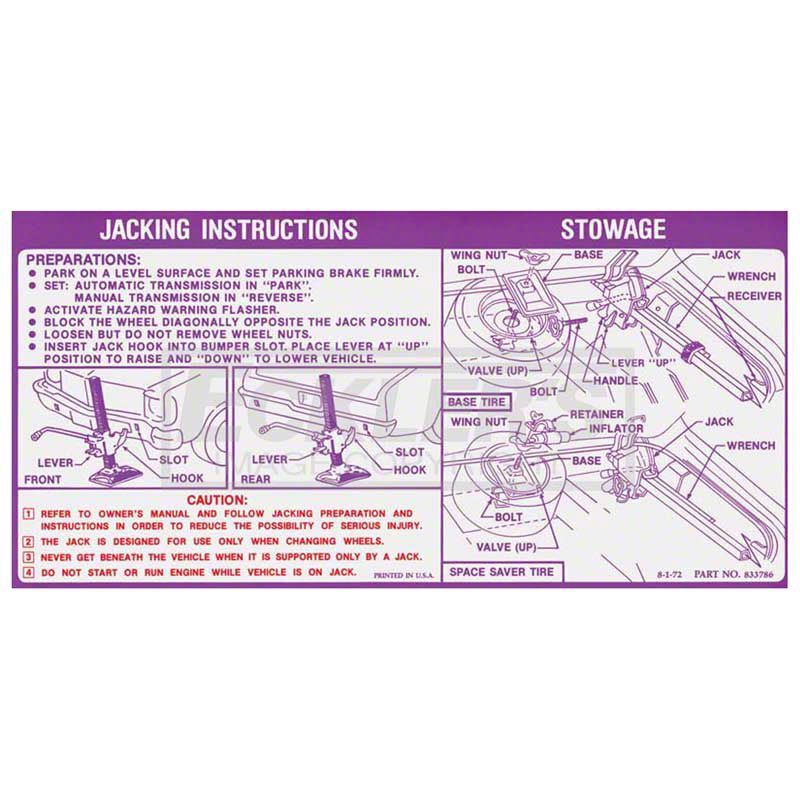 Decals add a finishing touch to your 1973 Nova restoration. Make sure your classic Chevrolet is show ready with new decals from Eckler's Nova. Our jacking instructions decal is self adhesive vinyl just like the original. It is crisply printed and show correct in every detail. Don't let your 1973 Nova lose points at the next car show. Replace your faded original jack decal with this great reproduction from Eckler's Nova.