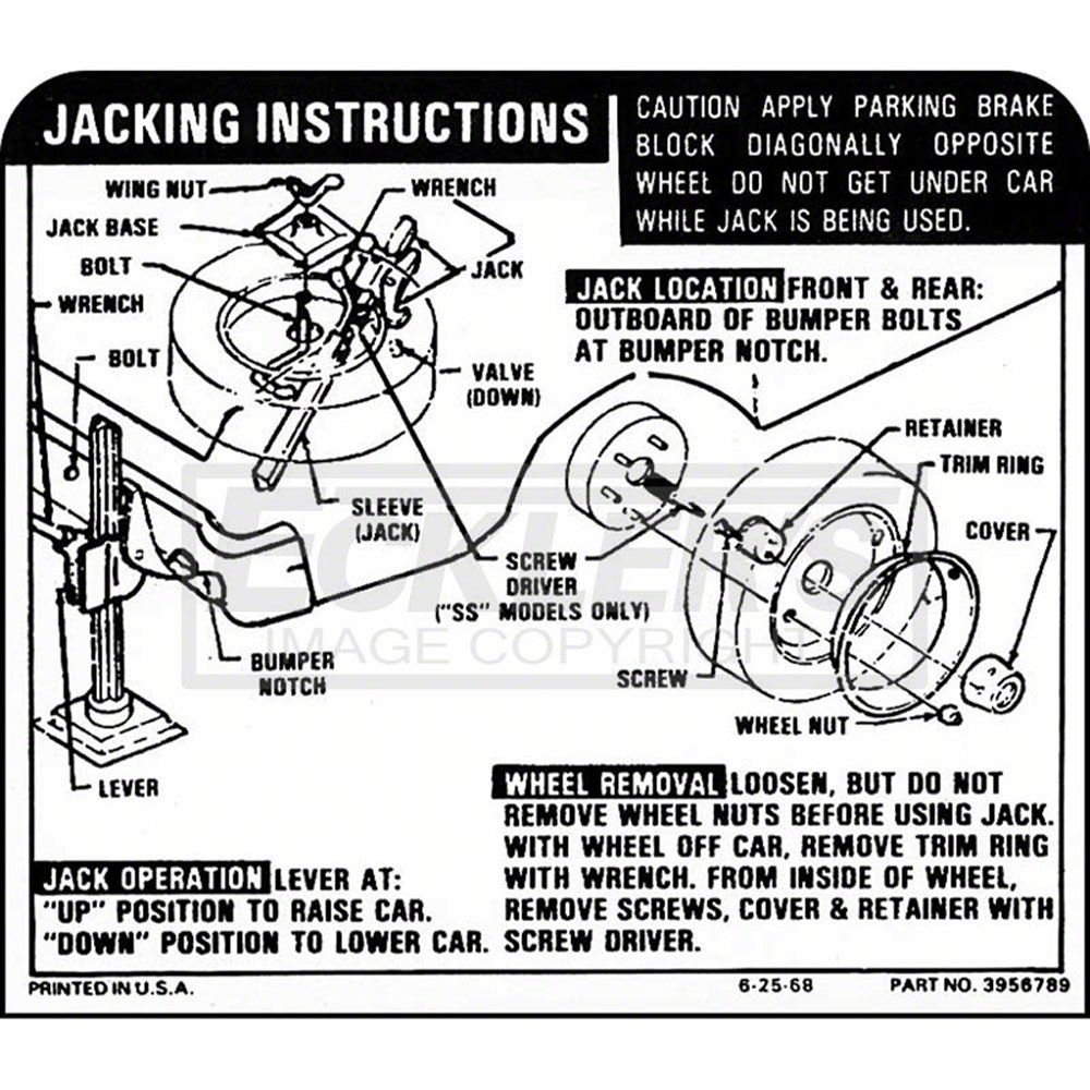 Decals add a finishing touch to your 1970 or 1971 Nova restoration. Make sure your classic Chevrolet is show ready with new decals from Eckler's Nova. Our jacking instructions decal is self adhesive vinyl just like the original. It is crisply printed and show correct in every detail. Don't let your 1970 or 1971 Nova lose points at the next car show. Replace your faded original jack decal with this great reproduction from Eckler's Nova.