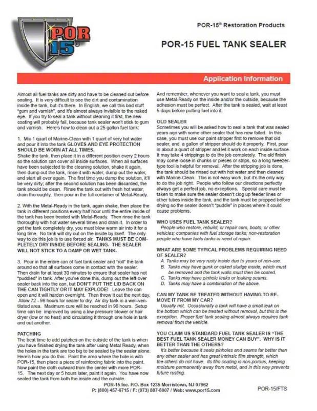 POR-15® Fuel Tank Sealer was formulated and developed their own laboratories due to the demand for a high-tech sealer impervious to all fuels, including the new Stage II fuels which have a high alcohol content. POR-15® Fuel Tank Sealer has superior strength and fuel resistance, and does not contain Methyl Ethyl Ketone, a highly flammable and deadly carcinogen (cancer-causing). POR-15® Fuel Tank Sealer is non-flammable and is environmentally safe.