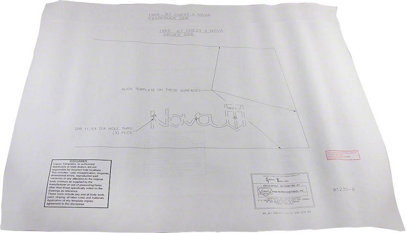 When you decide to install new emblems and body moldings to the sheet metal of your 1966 or 1967 Chevy Nova, it can be daunting to get started. You want an exact fit on your Nova, but you might lack the proper materials. Eckler's Nova is happy to be your solution, by offering the best emblem and body template kits for your Nova. These easy to use full-size digitally rendered emblem placement templates will exactly locate all body, fender, hood, header, and trunk lid emblem holes quickly and professionally. We also offer templates for lower body moldings, rear quarter panel louvers, backup lamps, antenna hole placement, sidemarker locations, and fenderwells. Don't spend another moment agonizing on how to best apply your new emblems or body components. Make the jo